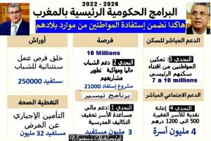 تنبيه حول الميزانيات: بعض البرامج (خصوصاً برامج إدماج محلي أو برامج على مستوى الوزارات) تموّل من اعتمادات مختلفة (ميزانية الدولة، صناديق اجتماعية، تمويلات مؤسساتية أو شراكات دولية)، لذلك غالبًا ما يكون من الصعب الحصول على « رقم واحد إجمالي » دون مراجعة مراسلات ومشاريع قانون مالية سنوية ومذكرات أداء كل وزارة. إذا تريد، أستطيع استخراج أرقام الميزانية الرسمية من مشاريع قوانين المالية 2022–2026 لكل برنامج (سأجلب مذكّرات وزارة الاقتصاد والمالية وتفاصيل النفقات).