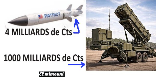 Le coût d’un seul missile Patriot revient a 4 millions de dollars. Une batterie Patriot complète peut recevoir 100 missiles cela représente un 1 milliard de dollars (400M pour les missiles et 600 pour le systeme)
