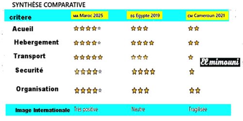 Maroc 2025 Egypte 2019 Cameroun 2021 Accueil & hébergement 🇲🇦 Maroc – CAN 2025 Points forts Accueil très structuré dès les aéroports (orientation, volontaires, langues). Hôtels haut standing pour les équipes + large offre touristique. Bonne répartition géographique des villes hôtes → moins de saturation. Image d’hospitalité très positive chezContinue Reading
